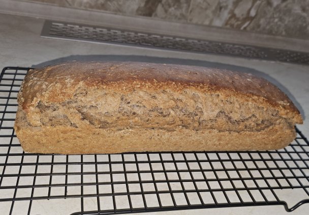 8. Pieczenie: Włóż formę na drugą półkę od dołu. Ustaw 180°C. Gdy piekarnik się nagrzeje (kontrolka zgaśnie), piecz przez około 55 minut, aż chlebek będzie złocisty.