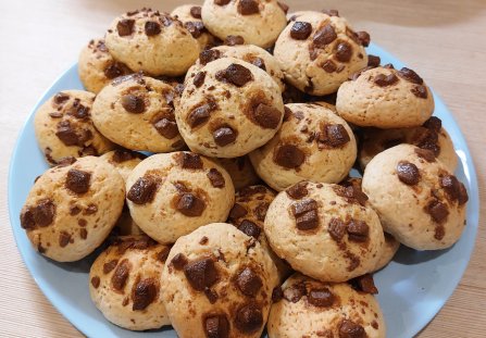 1. Pokrój czekoladę w kostkę i odłóż na później. 2. Wszystkie składniki odmierz i wrzuć do jednej miski. Zacznij mieszać ciasto widelcem, a po pierwszym połączeniu się składników, wrzuć połowę pokrojonej czekolady i zacznij wyrabiać ciasto ręką. 3. Z ciasta formuj małe kulki i kładź je w równych odstępach na blasze wyłożonej papierem do pieczenia. 4. Teraz zacznij równomiernie wbijać na górze kulek kawałki drugiej połowy czekolady, a następnie delikatnie rozpłaszcz każdą kulkę. (Im bardziej płaskie je zrobisz, tym bardziej będą twardsze.) 5. Włóż blachę z ciastkami do piekarnika nagrzanego do 180°C na czas 15-18 minut (w zależności od mocy piekarnika). 6. Smacznego!