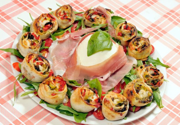 Deska przekąsek dla gości to połączenie ciepłych ślimaczków z pieczarkami, serem i papryką, a także miękkiej i aksamitnej burraty otoczonej szynką prosciutto.