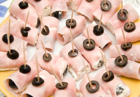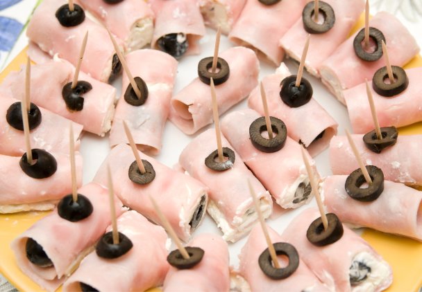 Imprezowe roladki z szynki udekoruj odłożonymi wcześniej plasterkami oliwek. Podawaj od razu po przygotowaniu.