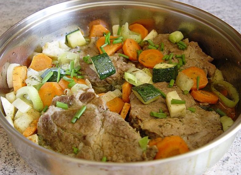 Następnie dodać cukinię ( kostka) i pora (talarki) i dusić kolejne 15 minut - całość ewentualnie doprawić.