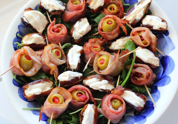 Na talerzu nałożyć zielone liście, a na nich poukładać koreczki. Smacznego! :)