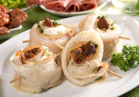 Zwiń filety w ciasną roladkę wzdłuż krótszego boku. Zabezpiecz koreczki rybne wykałaczkami i odkładaj pionowo w naczyniu żaroodpornym. Na wierzchu połóż pozostałe pomidory.