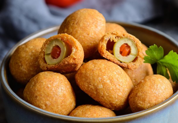 Upieczone oliwki w cieście możesz podać na ciepło lub po ostudzeniu.