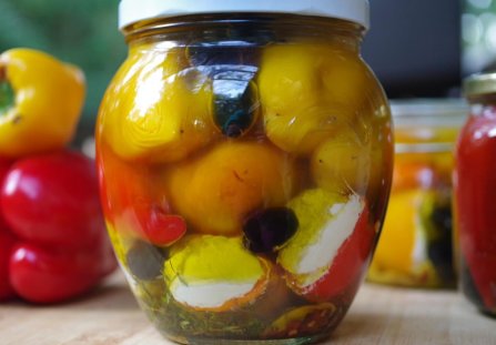 Chcę mieć możliwość przechowania papryczek z fetą w oliwie bez octu przez 2-3 miesiące w zimnej spiżarni. Dłużej nie próbowałam przechowywać. Kto nie ma zimnej spiżarni, powinien trzymać papryczki faszerowane fetą w lodówce.