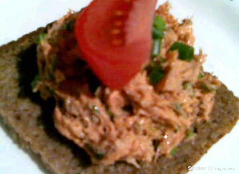 Dzielimy rybe na male kawaleczki, dodajemy pokrojone w kosteczke ogorki i mieszamy z majonezem i przecierem az sie dobrze polaczy. Doprawiamy sola i pieprzem. Smacznego :)