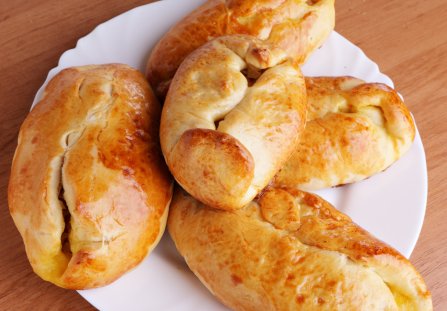 Uformuj paszteciki. Ciasto uderz i podziel je na ok. 20 części i uformuj z nich kulki. Rozpłaszcz je w dłoniach lub wałkiem na okrąg o średnicy ok. 10 cm. Nałóż na środek łyżeczkę nadzienia i zlep brzegi ze sobą, pozostawiając wewnątrz niewielką szczelinę lub otwór, by para wodna swobodnie mogła uciekać z wnętrza.