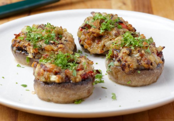 Do każdego kapelusza pieczarki nałóż solidną porcję farszu. Ułóż je na blasze i piecz 15-20 minut w 190°C aż nadzienie się zetnie i lekko zarumieni.