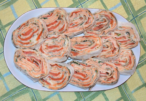 Zwiń tortille ciasno w rolady. Pokrój na kawałki o szerokości około 1,5 cm. Ułóż na półmisku. Schłodź w lodówce.