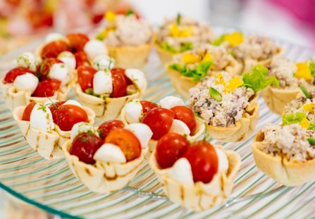 Przygotuj nadzienie caprese. Pomidorki przekrój na pół, a jeśli kulki mozzarelli są duże – te także przekrój. Do połowy koszyczków z tortilli wkładaj naprzemiennie pomidorki i ser. Skrop całość odrobiną oliwy i octu balsamicznego. Dopraw solą i pieprzem.