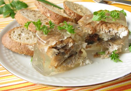Rybę opiekaną w galarecie podawaj udekorowaną posiekaną natką pietruszki.