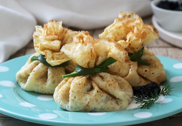Złóż sakiewki naleśnikowe. Na środek każdego naleśnika nakładaj solidną łyżkę nadzienia. Podwiń brzegi do góry i zwiąż sakiewki delikatnie szczypiorkiem.