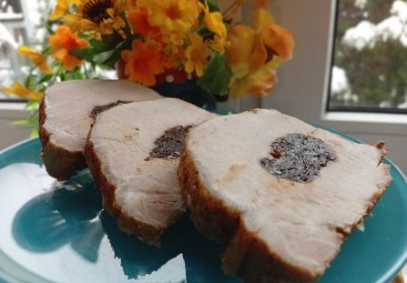 Połączyć wszystkie składniki na marynatę i dokładnie wymieszać. Mięso opłukać, osuszyć na ręczniku papierowym. Przeciąć na dwie równe części, przez środek kawałka schabu utworzyć kanał i wypełnić śliwkami. Tak przygotowany schab, przełożyć do naczynia żaroodpornego, zalać przygotowana marynatą, dobrze natrzeć, nakryć i odłożyć w chłodne miejsce do następnego dnia. Po czym wstawić do piekarnika nagrzanego do 180-190 stopni i piec prz1 ½ godziny co jakiś czas podlewając powstałym sosem. Po upływie tego czasu zdjąć pokrywkę i zrumienić na termo obiegu przez około ½ godziny również podlewając sosem. Mięso smakuje zarówno na ciepło jak i na zimno jako wspaniała przekąska na stole świątecznym. SMACZNEGO.
