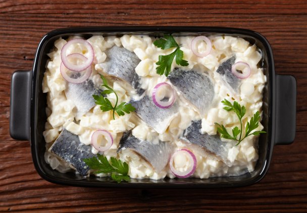 Matjasy to młode śledzie konserwowane solą, które zazwyczaj są delikatne i nie wymagają długiego moczenia tak jak tradycyjne solone śledzie. Jeśli jednak twoje filety są bardzo słone, możesz je szybko przepłukać pod bieżącą wodą lub namoczyć w zimnej wodzie czy mleku przez 15–30 minut, aby zredukować ich słoność. Pamiętaj, aby je dokładnie osuszyć przed krojeniem i zalaniem sosem. Alternatywnie sprawdzą się także śledzie w oleju, ale dobrze je wytrzyj z tłuszczu.