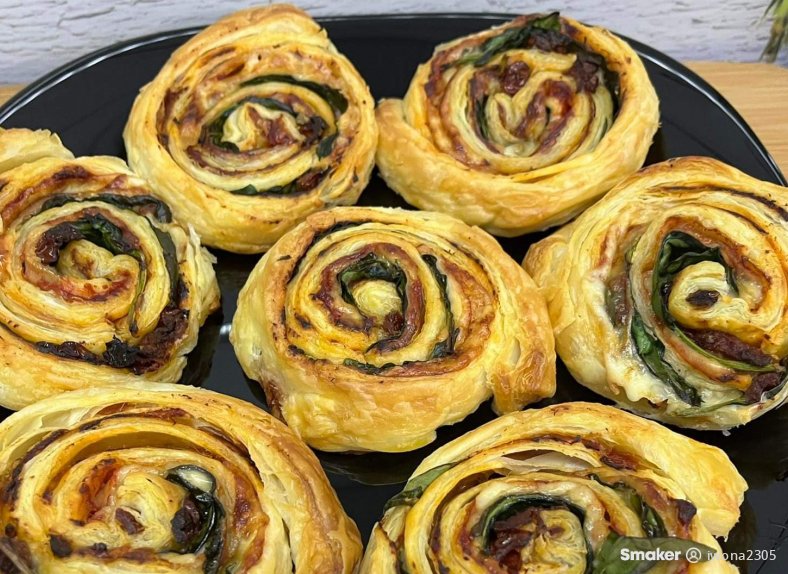 Pyszna przekąska z ciasta francuskiego z dodatkiem sera żółtego, szynki ,szpinaku i suszonych pomidorów,idealna na różne okazje.
