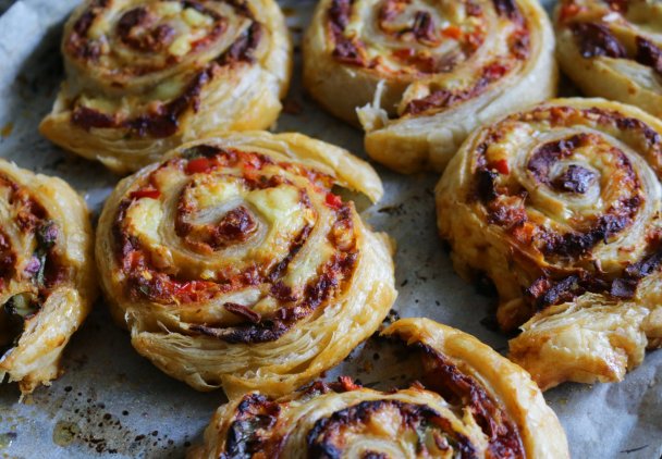 Ślimaczki z ciasta francuskiego a la pizza to wyśmienita przekąska imprezowa, która nawiązuje smakiem i wyglądem do najpopularniejszego chyba dania kuchni włoskiej. Całość jest lekko chrupiąca, wyrazista i pięknie się prezentuje na talerzu.