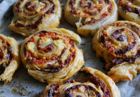 Ślimaczki z ciasta francuskiego a la pizza wstaw do piekarnika rozgrzanego do 200 st. Celsjusza i piecz przez 12-15 minut, do ładnego zezłocenia wierzchu.