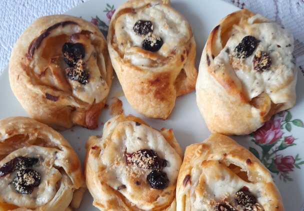 Jabłka obrać , zetrzeć na tarce o grubszych otworach, dodać cukier usmażyć , dodając pod koniec cynamon. Wystudzić. Ciasto francuskie rozłożyć , posmarować jabłkami zwinąć w rulon, podzielić na 9 części , ułożyć na blaszce wyłożonej papierem do pieczenia. Na wierzch ułożyć po łyżeczce serka, dodać parę żurawin, posypać mielonymi orzechami.