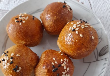 Z pozostałymi prostokątami postąpić tak samo. Następnie ułożyć na blaszce wyłożonej papierem do pieczenia. U mnie w air freyerze w obu komorach. Jajko roztrzepać i posmarować , posypać sezamami.