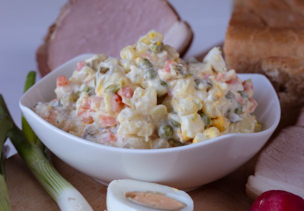 Ziemniaki ugotuj w mundurkach, razem z marchewką, pietruszką i selerem. Następnie ostudź całość, obierz ziemniaki i wszystkie warzywa pokrój w niewielką kostkę.