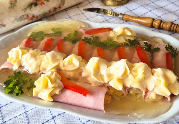 Następnie przyozdabiamy rulony ananasem pokrojonym w cząstki, papryką, pietruszką i rozetkami z majonezu (za pomocą worka cukierniczego i wybranej tylki). Na koniec zalewamy rolady lekko tężejącą galaretą. Wstawiamy do lodówki do całkowitego zastygnięcia galarety.