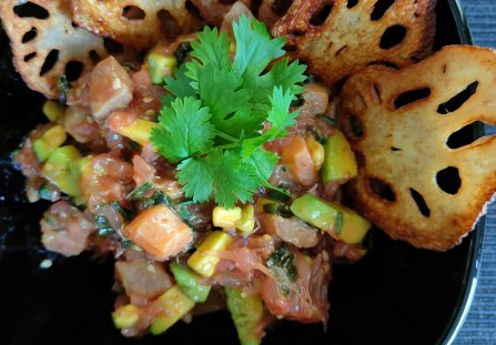 Łososia i awokado kroimy w drobną kostkę. Grejpfruta obieramy ze skóry i filetujemy, cząstki dodajemy do reszty składników. Dodajemy posiekaną trawę cytrynową oraz szczypiorek. Mieszamy z olejem sezamowym i przyprawą togarashi.