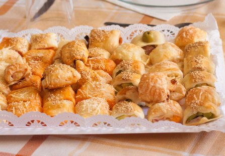 Rozwiń ciasto francuskie na blacie i przekrój je na 2-3 równe paski o szerokości ok. 10 cm. Na każdym z nich wyłóż w jednej linii nadzienie. Zwiń każdy pasek w roladkę i mocno dociśnij brzegi.