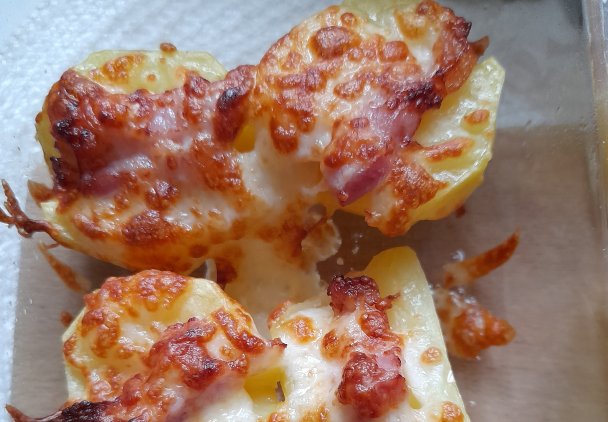 Ziemniaki obrać , przekroić na połowę , podgotować , aby były prawie miękkie w osolonej wodzie. Ser utrzeć na tarce o grubszych otworach, Ziemniaczki ułożyć na blaszce jeżeli zapiekamy w piekarniku lub w mniejszych naczyniach jeżeli zapiekamy we frytownicy beztłuszczowej. W każdym ziemniaczku nacinamy rowek.