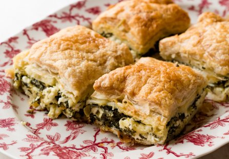Na spodzie ciasta rozsmaruj ricottę, ułóż mozzarellę, całość dopraw natką pietruszki i gałką muszkatołową. Rozłóż równomiernie farsz. Przykryj drugim blatem upieczonego ciasta francuskiego.
