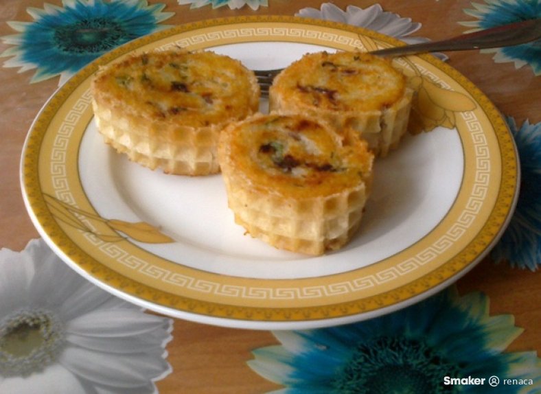 Gorącą masę rozsmarować na wafle, odczekać chwilę aż zmiękną i zrolować. Odstawić do ostudzenia, po czym pokroić na plastry grubości 2 cm (u mnie 3 kratki wafla :)) . Usmażyć z obu stron na złoty kolor.