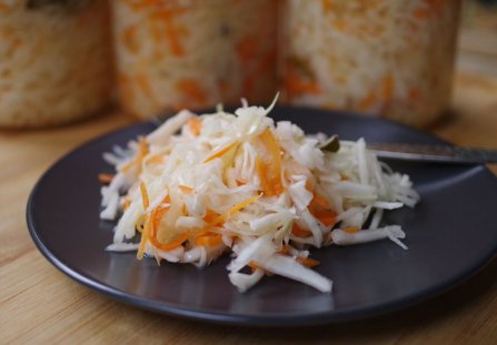Jak już wcześniej wspomniałam – autorka filmu twierdzi, że taką kapustę można stopniowo i po trochu podbierać ze słoika, zupełnie tak samo, jak kapustę kiszoną. I zupełnie tak samo wykorzystywać, zastępując nią tradycyjną kiszonkę. Czy to się sprawdzi – jeszcze nie wiem, ale co mi szkodzi spróbować? Nie jest to wprawdzie żywność probiotyczna, ale jako surówka z kapusty smakuje naprawdę bardzo dobrze. Dałam mężowi do spróbowania, nie mówiąc wcale, co to jest. Po pierwszym kęsie powiedział, że jest jeszcze za mało ukiszona, musi postać trochę dłużej. Ale za chwilę zjadł wszystko z talerzyka, bo „bardzo dobra ta kapusta!”