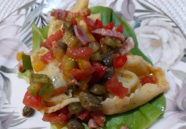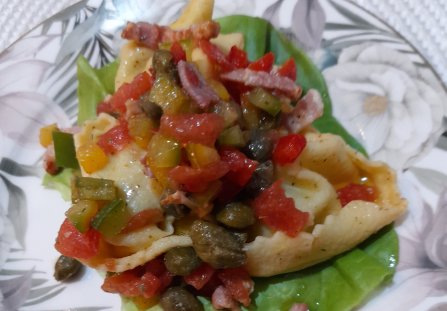 Tortellini ugotować zgodnie z przepisem na opakowaniu , wystudzić. Boczek wysmażyć , pozostawić na ręczniku papierowym aby się osączył. Papryki umyć , pokroić w kostkę umieścić w salaterce.