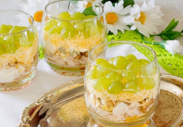 Sałatkę układaj warstwowo. Na spód wyłóż posiekanego kurczaka, następnie dodaj sparzone rodzynki. Składniki przykryj sosem. Na górę wyłóż tarty ser i pokrojone winogrona.