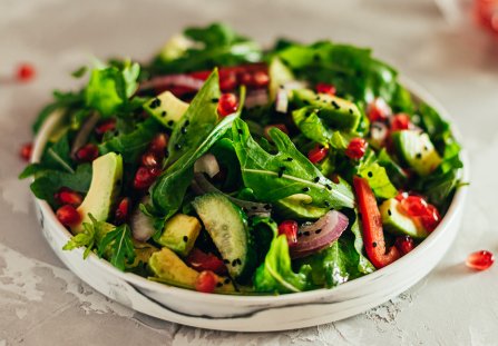 Wszystkie warzywa oraz nasiona granatu dodaj do rukoli. Całość wstępnie wymieszaj.