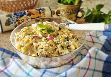 Jedna z najsmaczniejszych sałatek z makaronem ryżowym orzo w naszym arsenale, a to za sprawą aromatycznego kurczaka i warzyw polanych pysznym sosem czosnkowym. Poezja smaku i elegancji. Sałatka i na kolację i na imprezę. Największy jej walor to łatwość i ekspresowe wykonanie (30 minut z zegarkiem w ręku).