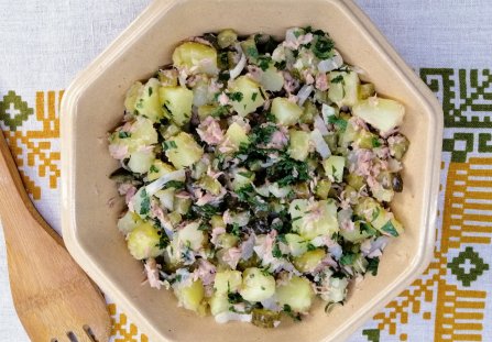 Sałatka z tuńczykiem z puszki, ziemniakami i kiszonym ogórkiem to danie, które często kojarzy się z domową kuchnią i prostotą. Łączy składniki łatwo dostępne, a jednocześnie sycące i wyraziste w smaku. Delikatny tuńczyk dobrze komponuje się z miękkimi ziemniakami i charakterystyczną kwasowością ogórków kiszonych. To propozycja idealna na szybką kolację, lunch do pracy albo poczęstunek dla gości. Sałatkę przygotowujemy bez pośpiechu, bo najlepiej smakuje po krótkim schłodzeniu.