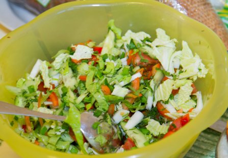 Wszystkie warzywa dodaj do miski z kapustą. Dorzuć drobno posiekaną natkę pietruszki.