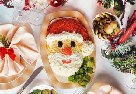 Sałatkę jarzynową przystrój startymi na tarce jajkami. Z białek zrób brodę, wąsy, górę czapki i pompon. Z żółtek twarz Mikołaja. Z przekrojonej oliwki oczy a z marchewki czapkę, nos i usta. Smacznego!