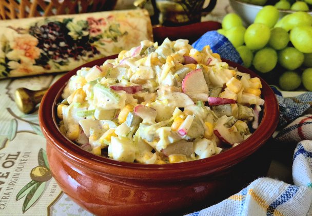 Kukurydzę osączamy z płynu. Jajka i ogórki kroimy w kostkę, rzodkiewkę w półplasterki, jeśli jest duża w ćwiartki. Wszystkie składniki sałatki przekładamy do miski. Dodajemy majonez, przeciśnięty przez praskę czosnek, pieprz i sól. Skrapiamy sałatkę sokiem z cytryny. Mieszamy, odstawiamy do lodówki na pół godzinki.