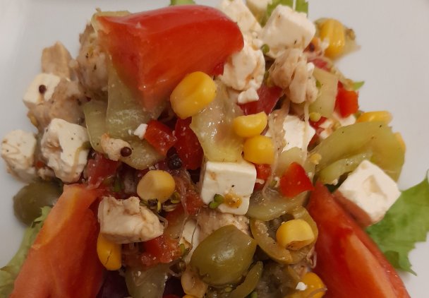 Warzywa uzupełnione smażonym filetem z kurczaka oraz serem feta to smaczna i apetyczna sałatka do której warto wracać.