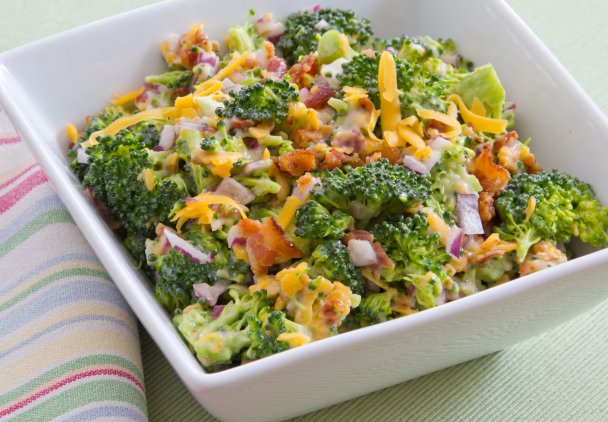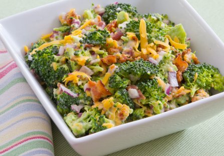 Sałatka amerykańska z brokułów łączy przeciwności. Znajdziesz w niej zarówno słodycz, jak i pikanterię, zarówno składniki rozpływające się w ustach, jak i przyjemnie chrupiące. Na tę popularną w Stanach Zjednoczonych sałatkę nie ma jednego, ortodoksyjnego przepisu. Możesz więc zastąpić rodzynki żurawiną, a cheddar parmezanem. Ważne, by sałatka była kolorowa i zaskakiwała kontrastami.