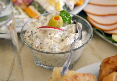 Bezpośrednio przed podaniem udekoruj wierzch plasterkami rzodkiewki, faszerowanymi oliwkami i siekaną natką pietruszki.