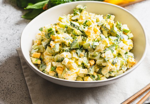 Jajka ugotuj na twardo, ostudź, obierz i pokrój w kostkę.