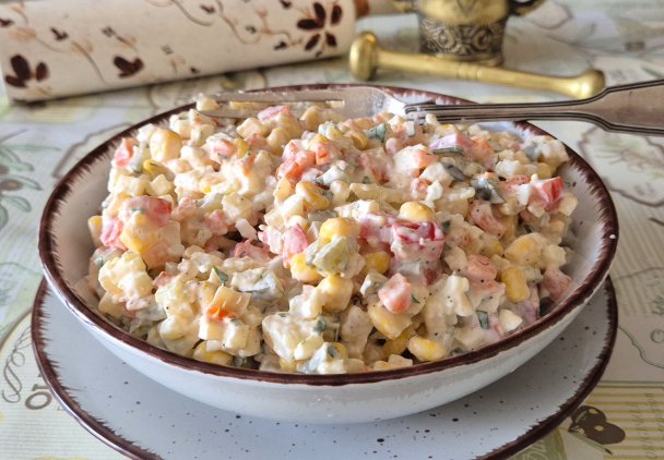 Ogórki konserwowe, obrane ze skórki jabłko, jajka, marchew, paprykę i seler kroimy w drobną kostkę. Kukurydzę z puszki osączamy na sitku, dodajemy do sałatki. Całość doprawiamy solą i pieprzem drobno zmielonym według uznania. Dodajemy majonez i posiekaną natkę. Wszystkie składniki sałatki delikatnie mieszamy. Odstawiamy do lodówki na 1 - 2 godziny do schłodzenia. W tym czasie smaki się "przegryzą". Teraz możemy spróbować sałatkę i ewentualnie doprawić jeszcze pieprzem i solą do smaku.