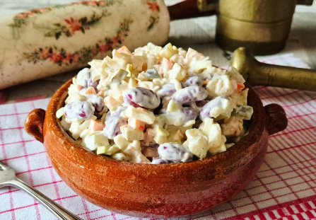Prawie zawsze warzywa pozostałe po gotowaniu rosołu wykorzystujemy do sałatek jarzynowych. Najczęściej robimy tradycyjną, ponieważ lubimy ją najbardziej, ale czasami zdarza się nam popełnić jakiś mały eksperyment, odstępstwo od rutyny. Dzisiejsza sałatka jest właśnie takim małym eksperymentem. W większości tradycyjna, ale z małymi odmiennymi dodatkami. Równie smaczna jak tradycyjna jarzynowa lecz mniej pracochłonna i to jest jej wielka zaleta.