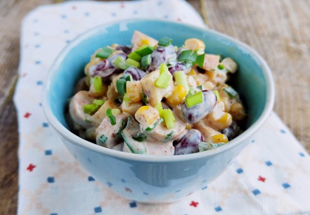 ...sałatka którą od wielu, wielu lat u nas robimy...oczywiście z Meksykiem chyba prócz fasoli, ostrości chili i kukurydzy nie ma nic wspólnego. No ale kiedyś panowały takie nazwy dań. Sałatkę meksykańską robimy co jakiś czas bo jest smaczna, szybko się robi i wszystkim smakuje..