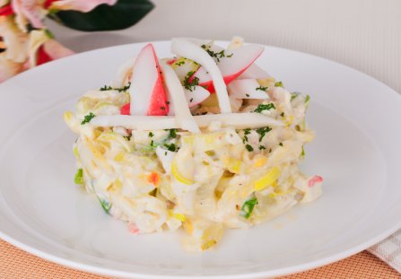 Wykładaj sałatkę na Trzech Króli na talerz, udekoruj małymi kawałkami surimi.