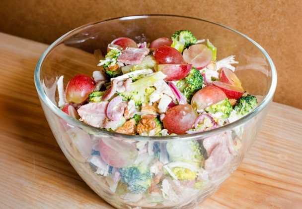 W dużej misce umieść ostudzone różyczki brokułów, przekrojone na pół winogrona, posiekaną drobno czerwoną cebulę oraz natkę pietruszki. Dodaj boczek i orzechy włoskie.