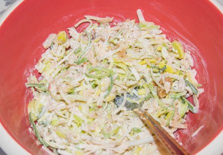 W dużej misce połącz pokrojone pory, jajka i starte jabłko.