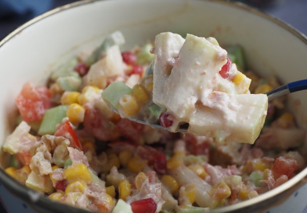 Ogórki i paprykę pokrój w równą kostkę średniej wielkości, a kukurydzę odsącz z zalewy. Połącz ze sobą wszystkie składniki.
